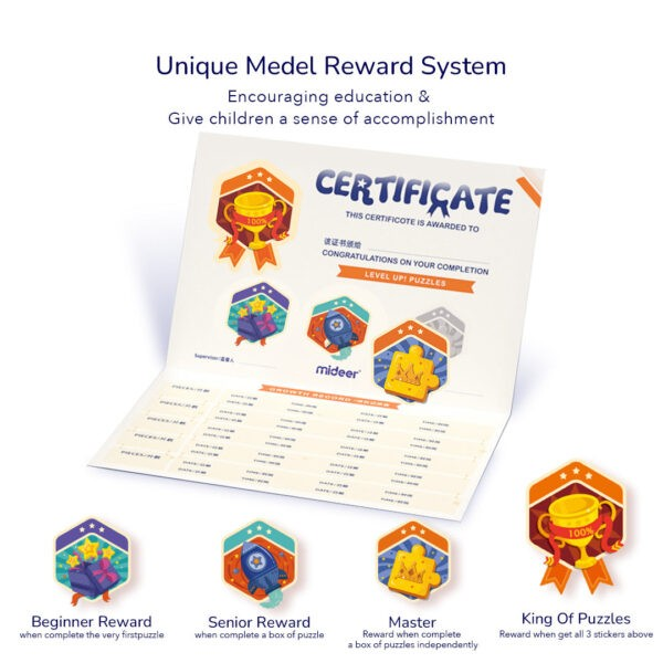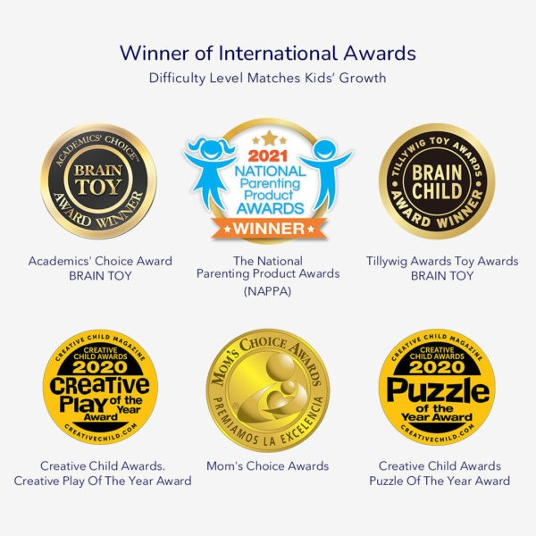 Komplekte: 3 dėlionės, 1 instrukcija, 1 tėvų vadovas, 1 sertifikatas, 1 lipdukas