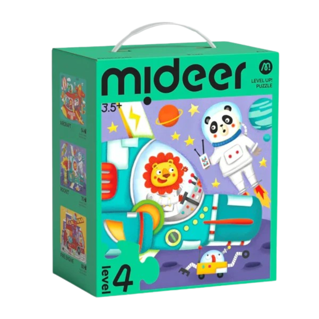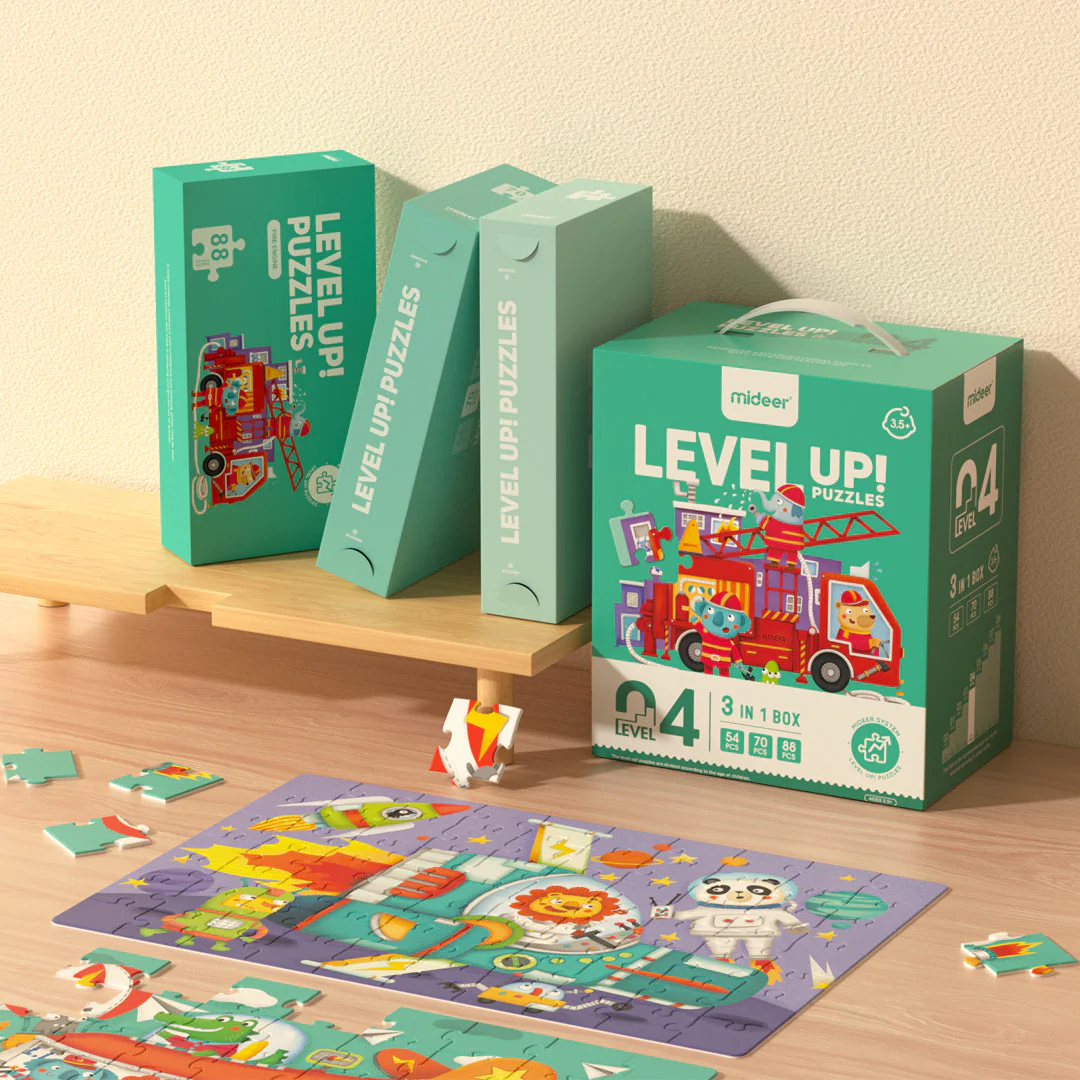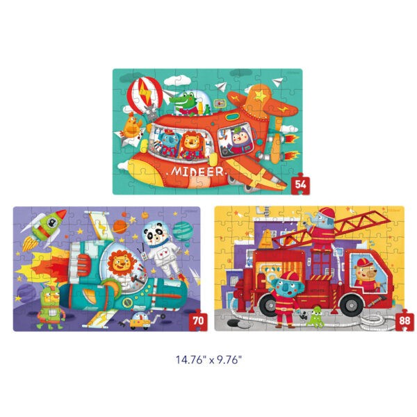 4 lygis: Transporto Priemonės tema apima 3 dėlionės vienoje dėžėje ir pristato gyvūnų miesto gyvūnus, kurie keliauja lėktuvu, gaisrine mašina ir raketa, tyrinėdami pasaulį.