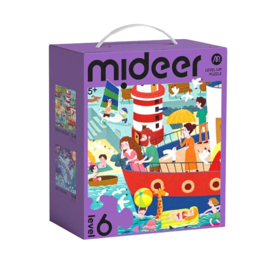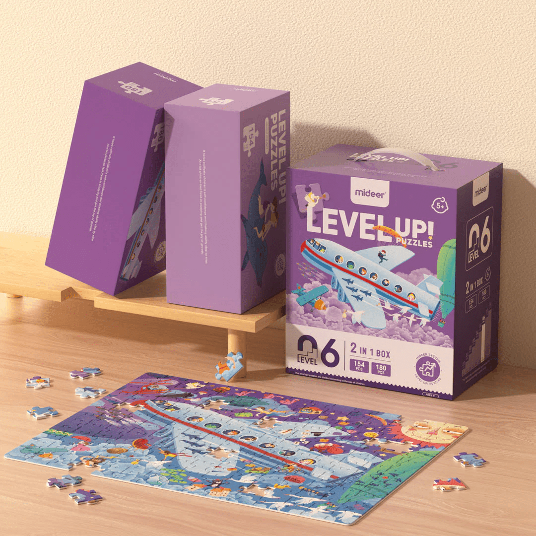 Level Up dėlionės serija, skirta vaikų intelektiniam vystymuisi ir smegenų stimuliacijai visais aspektais, susideda iš 8 lygių. Kiekviename lygyje dėlionės dalių skaičius didėja, nuo paprastų gyvūnų iki sudėtingų scenų, žingsniu po žingsnio gerinant vaikų pažinimą. Įvairūs meno stiliai žadina vaikų vaizduotę, o lygūs bei be aštrių kraštų kraštai užtikrina saugų rankų naudojimą žaidžiant ir mokantis. 6 lygis: Atostogų tema apima 2 dėliones vienoje dėžėje ir yra skirta Džeko atostogų gyvenimui lėktuve keliaujant į paplūdimį, kuris pilnas džiaugsmo ir vaizduotės.